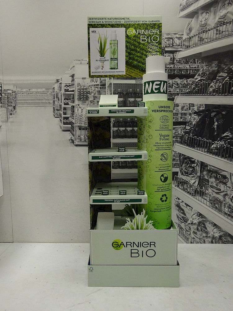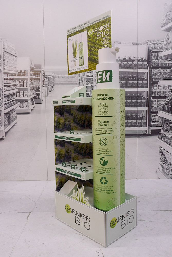 Naturalness is a real asset at the checkout. This display therefore emphasizes this very characteristic of the presented product range. The natural cosmetics line L'Oreál Garnier Bio is staged on a 100 percent corrugated cardboard placement.