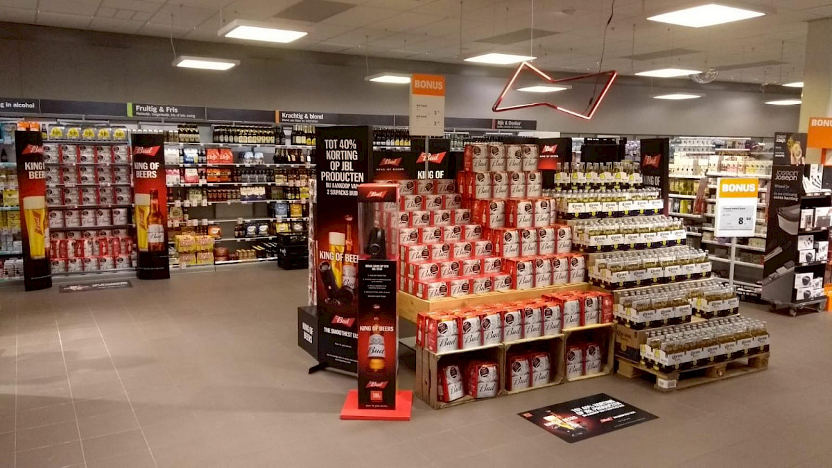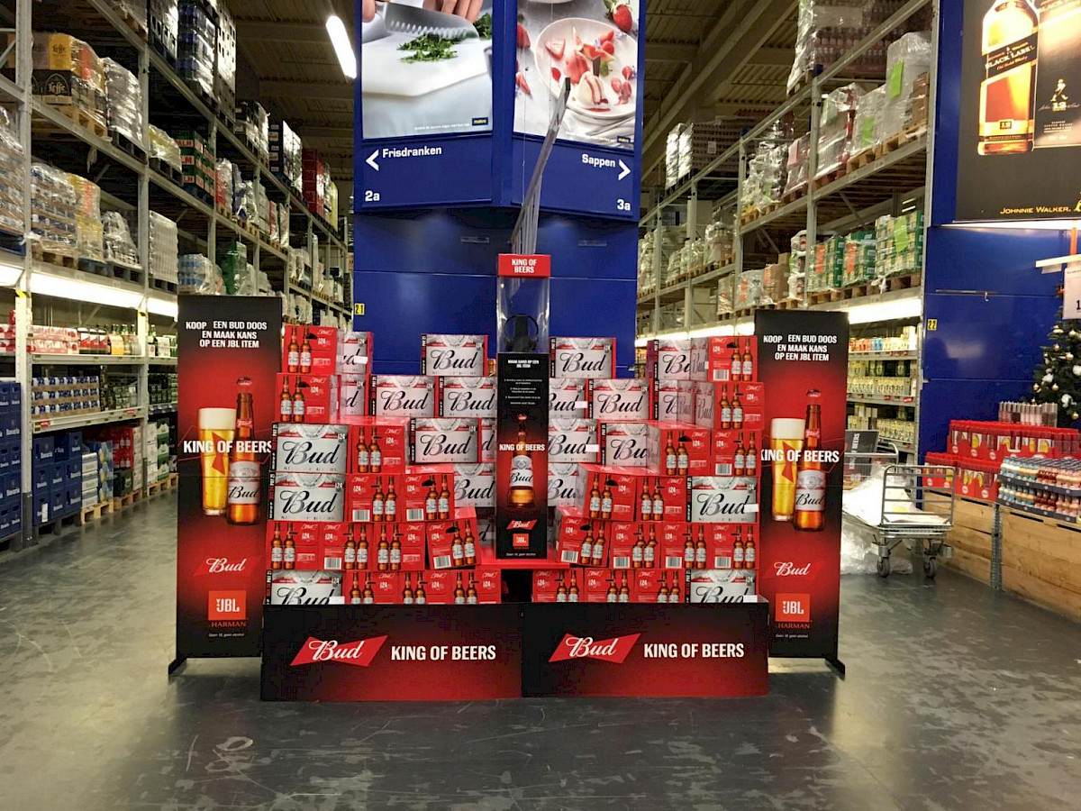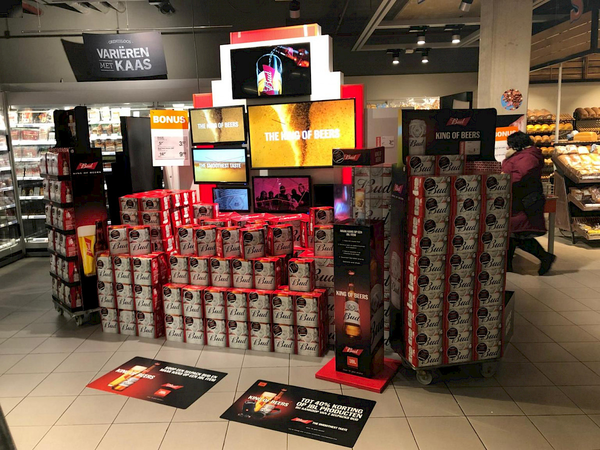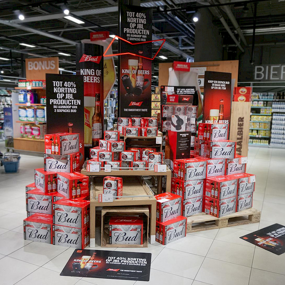 Budweiser, also known as King of Beers, wants to conquer the Netherlands. And for that purpose, a hefty promotional campaign has been set up, expanded to include a whole host of displays.