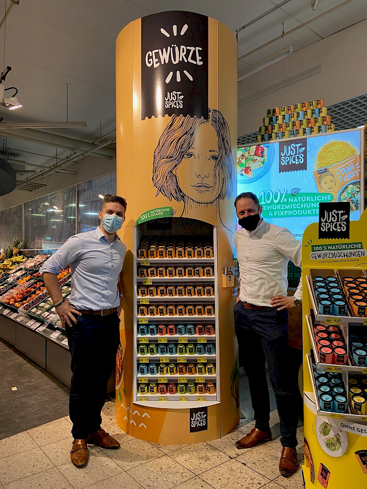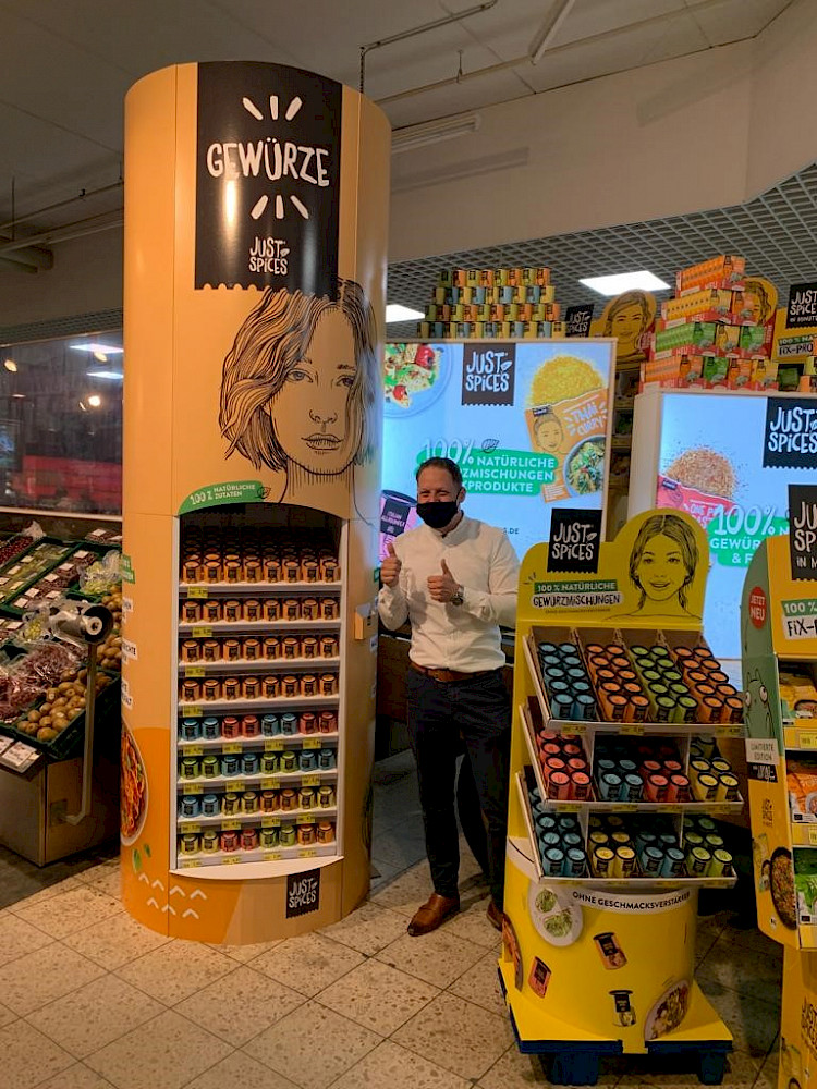 The display is designed to resemble one of the spice jars of Just Spices, making it immediately clear what product the display is highlighting. Thanks to its enormous size and bright colour, the display also catches the eye immediately.